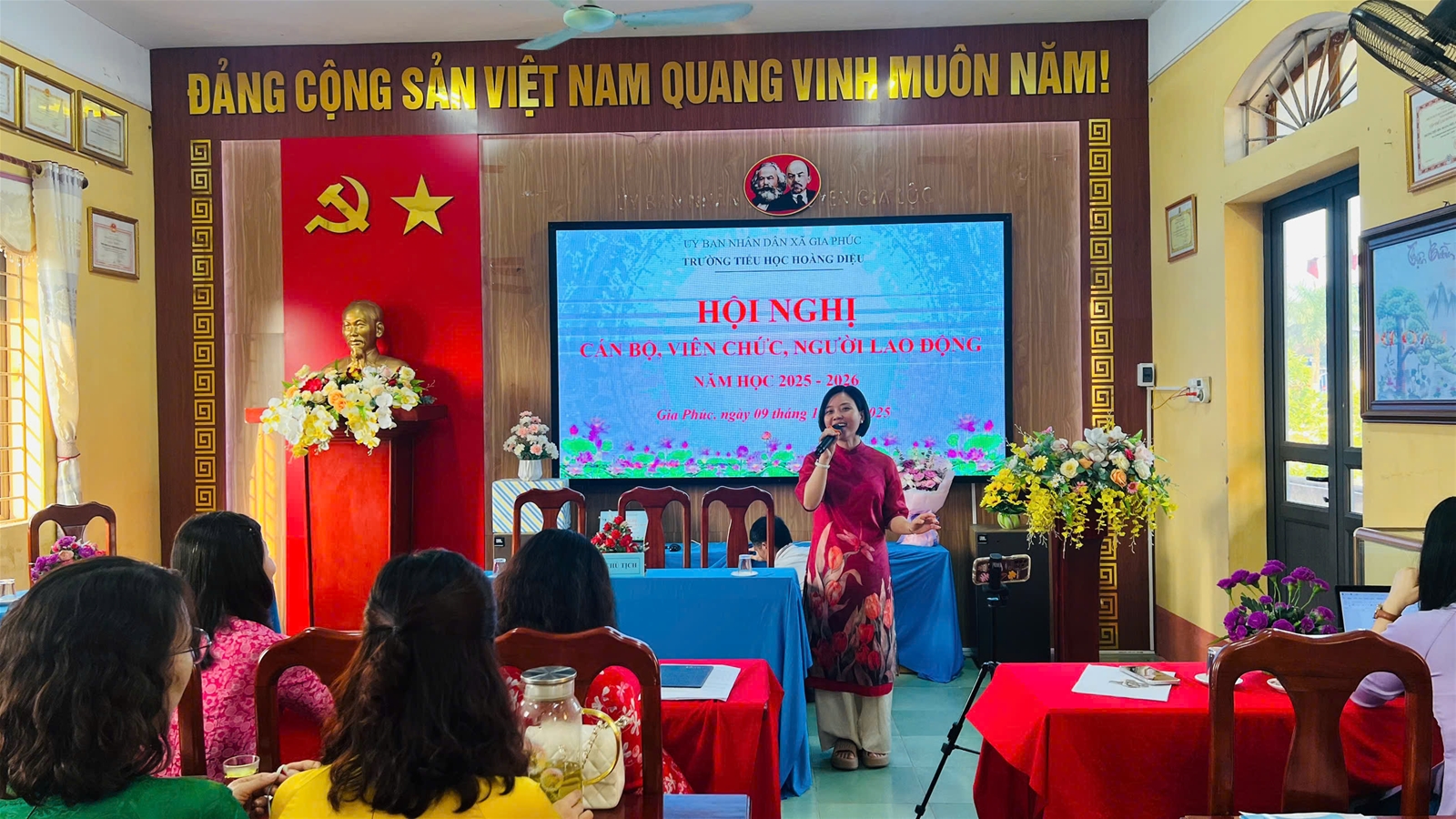 Hội nghị cán bộ viên chức năm học 2025-2026 của Trường Tiểu học Hoàng Diệu đã thành công tốt đẹp. Với truyền thống đoàn kết, tinh thần quyết tâm khắc phục mọi khó khăn hoàn thành tốt nhiệm vụ được giao, tập thể cán bộ, giáo viên, nhân viên Trường Tiểu học Hoàng Diệu tin tưởng vào một năm học mới với nhiều thắng lợi mới.